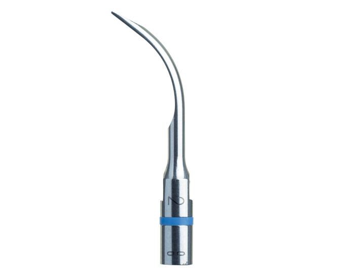 Насадка № 2. Мощная, рабочая часть толще, чем у насадки №1, применяется для удаления зубных отложений на зубах крупного размера или для удаления крупных конгломератов твердых зубных отложений, удаления фрагментов временных ортопедических конструкций и остатков цементов их фиксирующих; очистки расцементировавшихшихся коронок от старого цемента при поторной фиксации (на небольшой мощности, до 10) во избежание откола облицовки коронки. Благодаря выраженным боковым краям, эффективно работает даже при прислонении ее боковой гранью. Синяя полоса (Скайлинг).